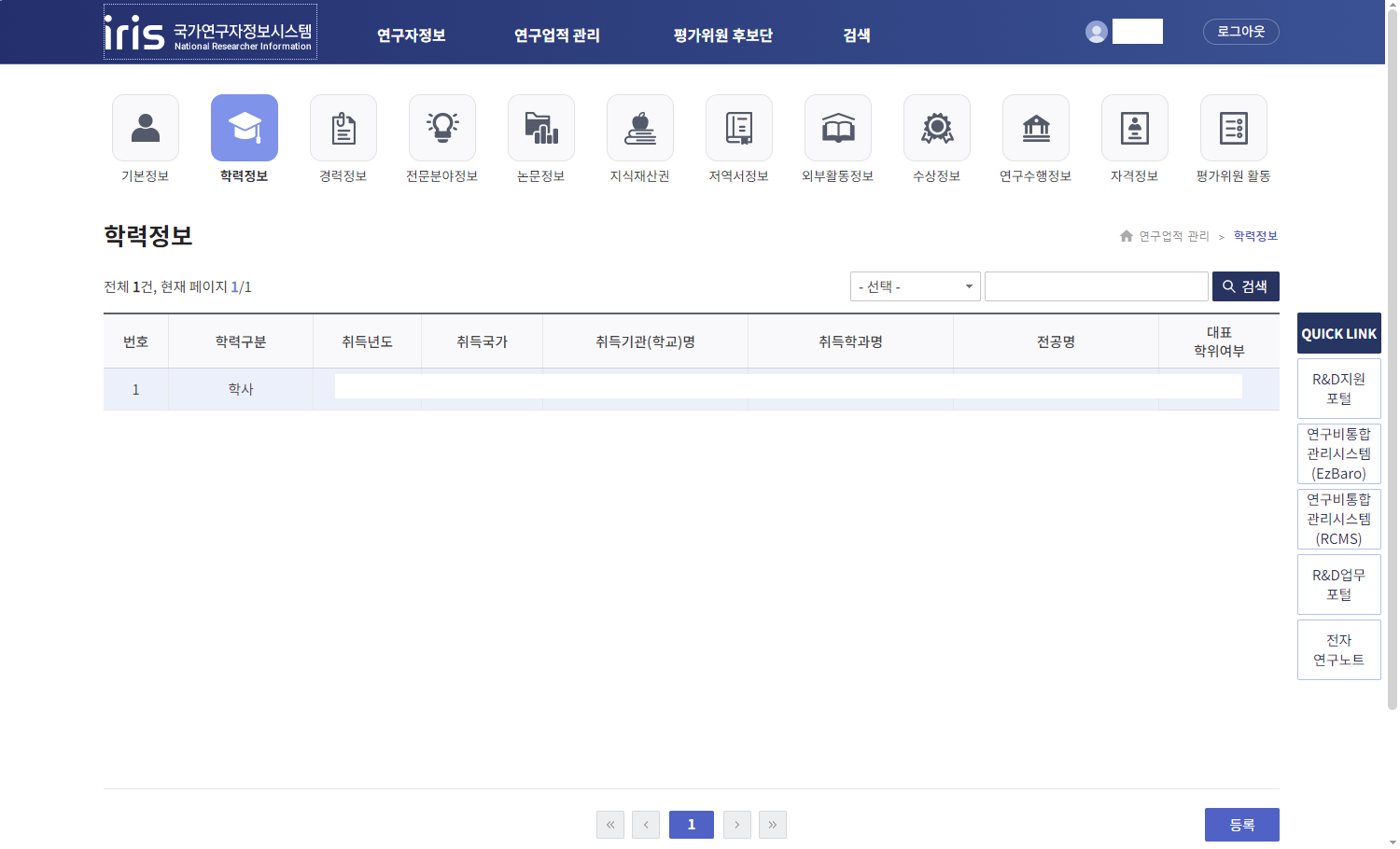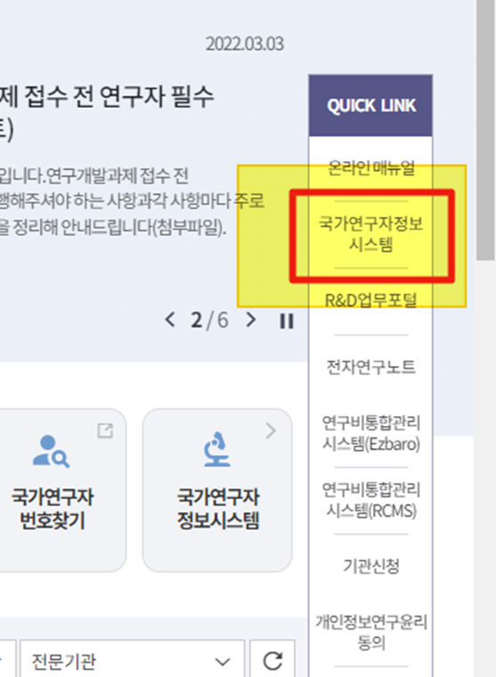 또는 https://www.iris.go.kr/main.do 접속 후 QUICK LINK 에서 [[ 국가연구자정보시스템 ]] 접속